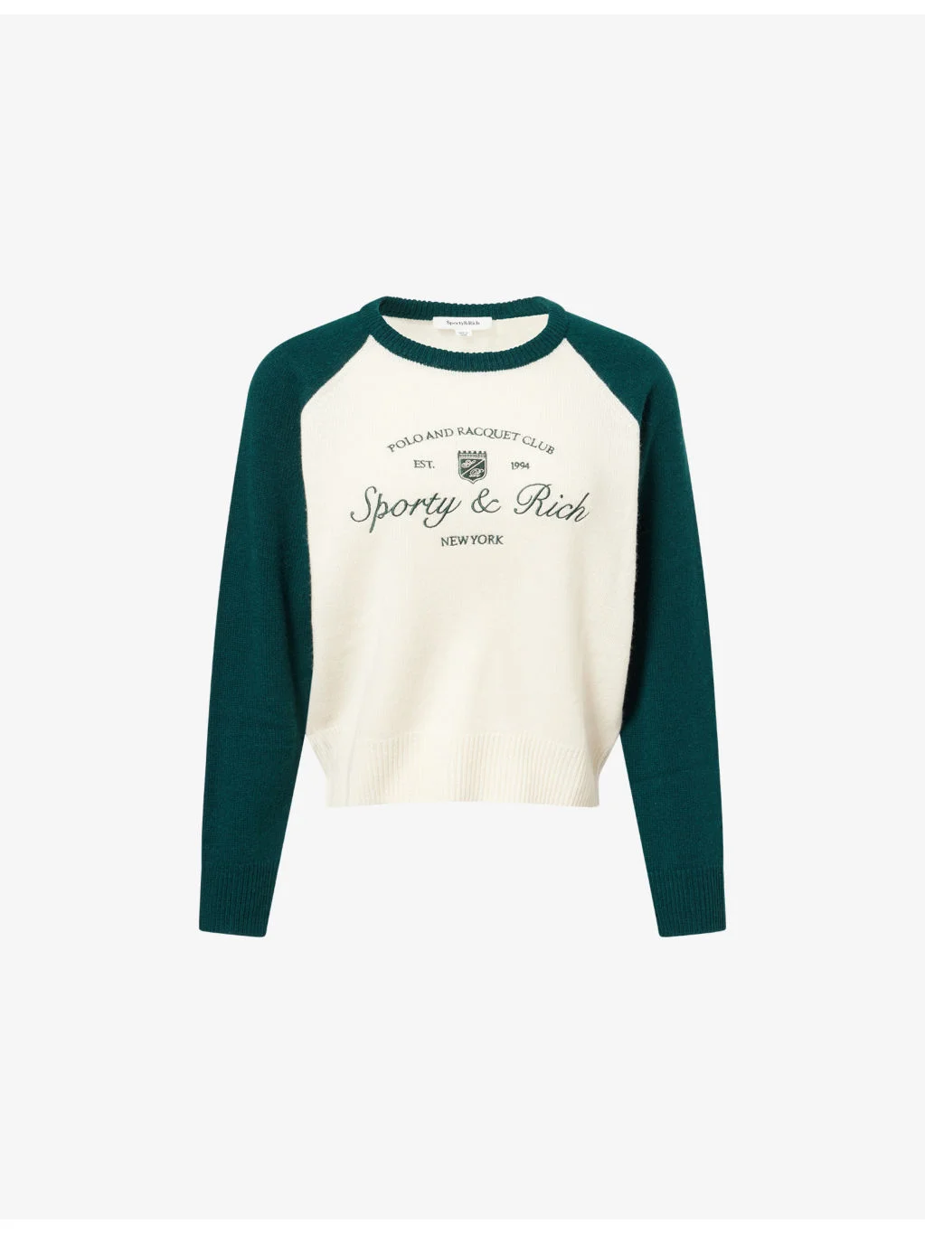 PRODUCT DETAILS - Sporty & Rich cashmere-and-wool jumper - 70% cashmere, 30% wool - Regular fit, round neck, contrasting long sleeves, embroidered logo at front - Hand wash - True to size - Model is 5ft 10in/1.78m and wears a size small - Midweight, slight stretch Ref: R04561381