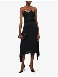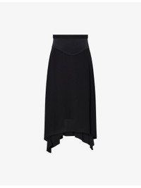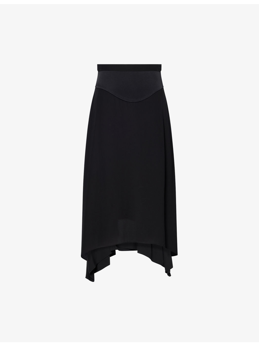PRODUCT DETAILS - Stella McCartney silk midi skirt - 100% silk; contrast 73% acetate, 27% viscose - Concealed zip fastening at back - Regular fit, high-rise, structured waistband, asymmetric hem, midi length - Dry clean - Made in Romania - Size UK 8: length 30.5in / 77.5cm - Model is 5ft 10in/1.78m and wears a size UK 8 - Lightweight, non-stretch Ref: R04496973