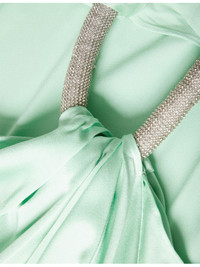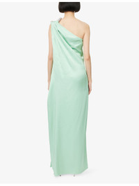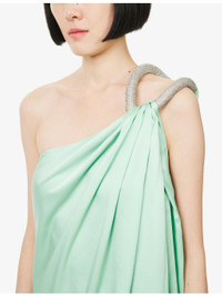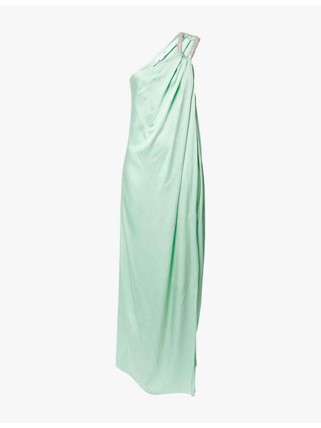 PRODUCT DETAILS - Stella McCartney woven maxi dress - 73% acetate, 27% viscose - Relaxed fit, asymmetric neckline, one cut-out crystal-embellished padded shoulder strap, ruched at front, split at front, all-over satin texture - Specialist dry clean - Made in Romania - True to size - Size UK 8: length 60in / 152cm - Model is 5ft 10in/1.78m and wears a size UK 8 - Lightweight, stretchy Ref: R04496847