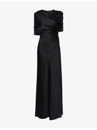 PRODUCT DETAILS - Stella McCartney satin gown - 73% acetate, 27% viscose - Concealed zip fastening - Regular fit, round neckline, short sleeves, draped cape at shoulders, flared hem - Dry clean only - True to size - Size UK 8: length 64in / 162cm - Model is 5ft 10in/1.78m and wears a size UK 8 - Lightweight, non-stretch Ref: R04550393