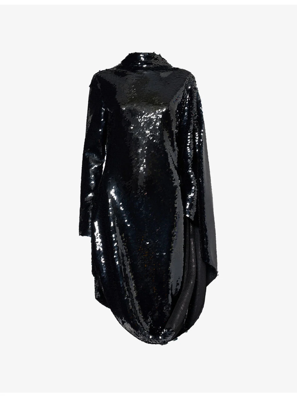 PRODUCT DETAILS - Stella McCartney woven mini dress - 100% polyester - Concealed zip fastening - Regular fit, high neck, long sleeves, draped design, sequin woven - Dry clean only - True to size - Size UK 8: length 100cm - Model is 5ft 10in/1.78m and wears a size UK 8 - Lightweight, non-stretch Ref: R04550397