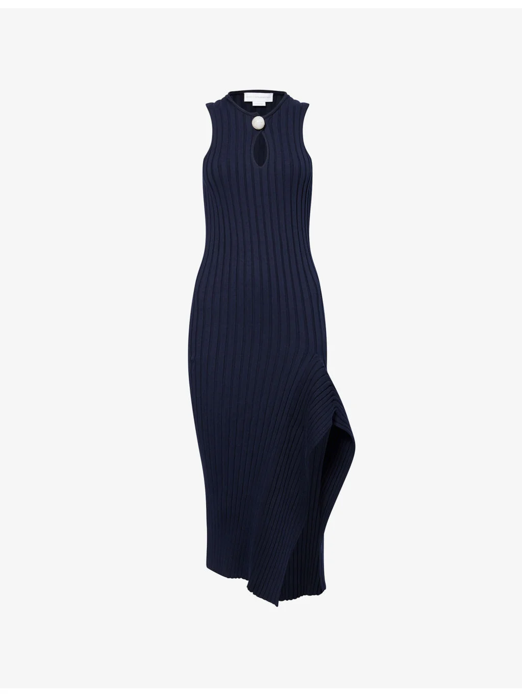PRODUCT DETAILS - Stella McCartney cotton knitted midi dress - 100% cotton - Slim fit, round neck, sleeveless, keyhole silhouette at front, panelled ribbed knit, sculptural asymmetric hem - Dry clean only - True to size - Model is 5ft 10in/1.78m and wears a size small - Midweight, stretchy Ref: R04550417
