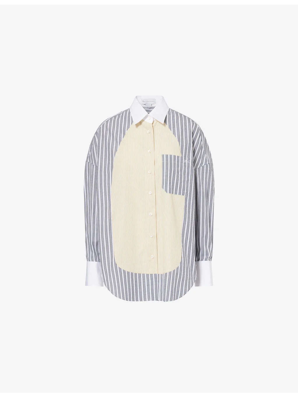 PRODUCT DETAILS - Stella McCartney cotton shirt - 100% cotton - Button fastening - Oversized fit, collar, long sleeves, buttoned cuffs, patch pocket at chest, panelled stripe pattern, curved hem - Dry clean only - Made in Romania - True to size - Size UK 8: length 30in / 76cm - Model is 5ft 10in/1.78m and wears a size UK 8 - Lightweight, non-stretch Ref: R04550381