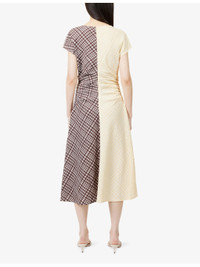PRODUCT DETAILS - STINE GOYA stretch-woven midi dress - 80% polyester, 17% rayon, 3% elastane - Concealed zip fastening at back - V-neck opening, capped sleeves, fitted bodice, ruched waist, two slip pockets at sides, relaxed leg, midi length, all-over contrasting check print - Machine wash cold - True to size - Size small: length 46.8in / 119cm - Model is 5ft 10in/1.78m and wears a size small - Lightweight, slight stretch Ref: R04492842