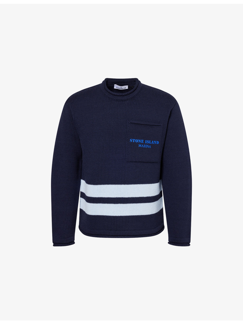 PRODUCT DETAILS - Stone Island wool jumper - 100% wool - Crewneck, long sleeves, one patch pocket at front, text print at pocket, striped detailing, ribbed trims - Hand wash - Made in Italy - Model is 6ft 2in/1.88m and wears a size medium - Lightweight, non-stretch Ref: R04484342