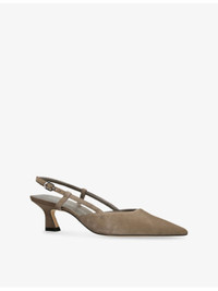 PRODUCT DETAILS - Stuart Weitzman suede slingback courts - 100% suede - Adjustable buckle fastening - Closed pointed toe, slingback strap, covered sculptural heel - Heel height 2.75” - Specialist leather clean - Upper: 100% suede - Lining: 100% leather - Sole: 100% leather Ref: R04473038