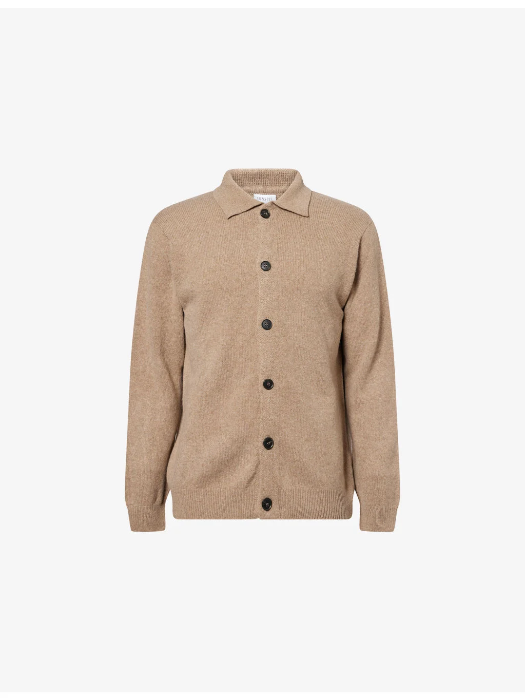 PRODUCT DETAILS - Sunspel lambswool cardigan - 100% lambs wool - Exposed button fastenings at front - Regular fit, pointed collar, long sleeves, horn buttons, ribbed trims, knitted - Hand wash cold - Model is 6ft 2in/1.88m and wears a size medium - Midweight, slight stretch Ref: R04551875