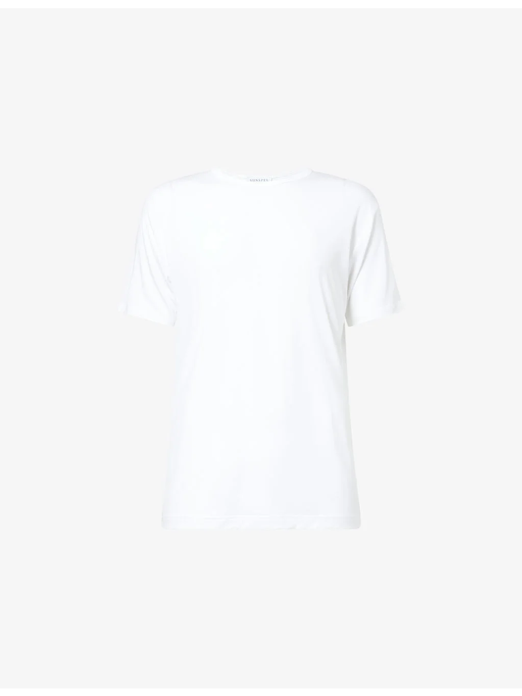 PRODUCT DETAILS - Sunspel stretch-jersey T-shirt - 95% TENCEL™, 5% elastane - Regular fit, crewneck, short sleeves - Machine wash at 30°C - Made in Portugal - Model is 6ft 2in/1.88m and wears a size medium - Lightweight, stretchy Ref: R04520311