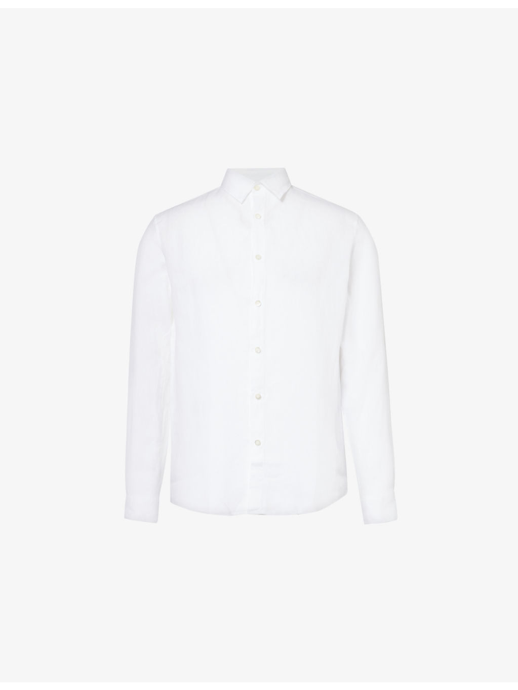 PRODUCT DETAILS - Sunspel linen shirt - 100% linen - Exposed button fastenings at front - Spread collar - Buttoned cuffs - Regular fit, long sleeves, curved hem - Machine wash at 40°C - Size medium: length 30in / 77cm, chest 42in / 107cm - Model is 6ft 2in/1.88m and wears a size medium - Midweight, non-stretch Ref: R04440215
