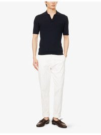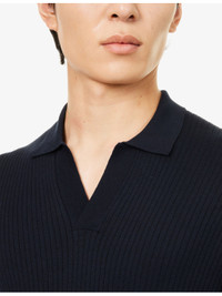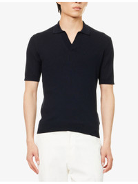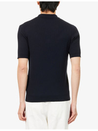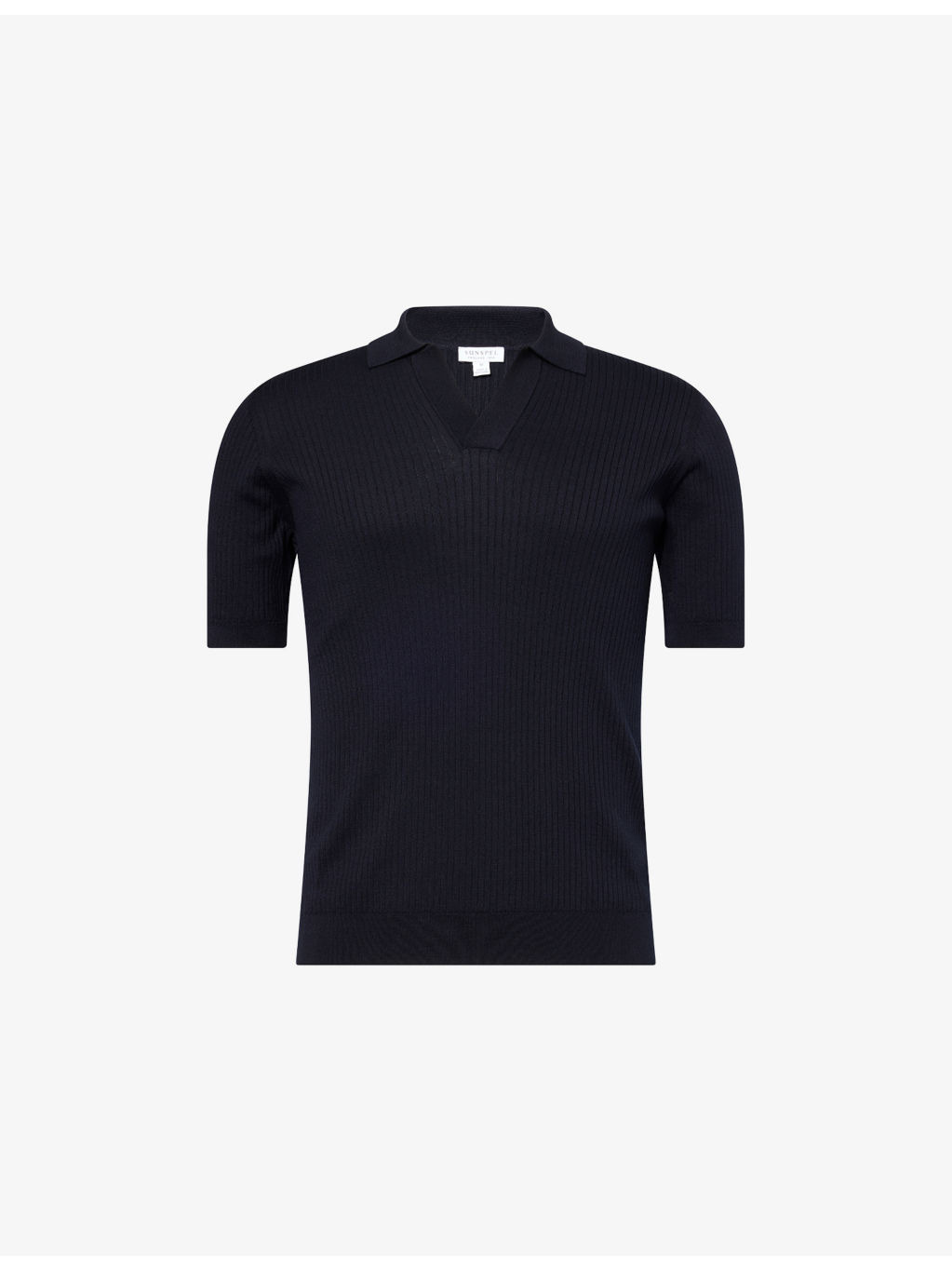PRODUCT DETAILS - Sunspel knitted polo top - 55% silk, 45% cotton - Slim fit, collar, short sleeves, V-neck, all-over ribbed texture - Machine wash at 30°C - Made in Portugal - Model is 6ft 2in/1.88m and wears a size medium - Lightweight, stretchy Ref: R04472164