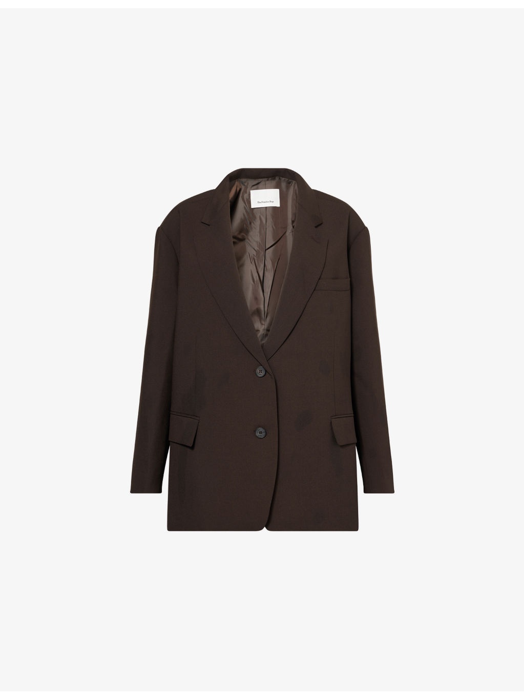 PRODUCT DETAILS - The Frankie Shop stretch-woven blazer - 96% polyester, 4% elastane; lining 100% polyester - Exposed button fastenings at front - Relaxed fit, single-breasted, notch lapels, long sleeves, buttoned cuffs, one chest welt pocket, two side flap pockets, two rear vents fully lined - Dry clean - Made in South Korea - True to size - Size small: length 30in / 76.5cm - Model is 5ft 10in/1.78m and wears a size small - Midweight, non-stretch Ref: R04500023
