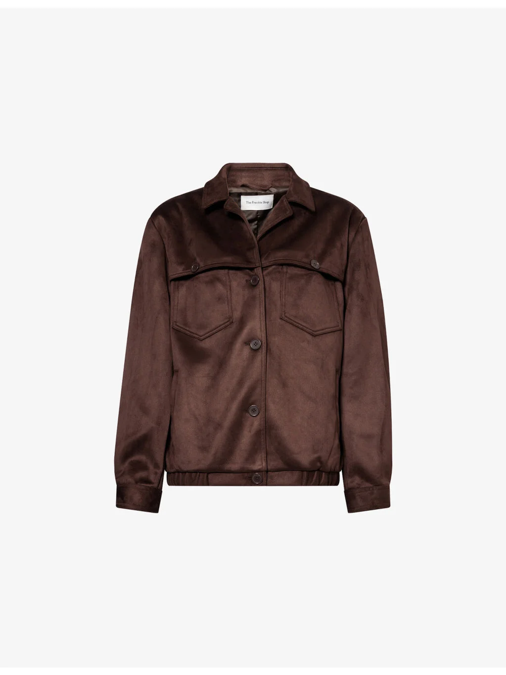 PRODUCT DETAILS - The Frankie Shop faux-suede jacket - 100% polyester; contrast 96% polyester, 4% elastane; lining 100% polyester - Exposed button fastening at front - Relaxed fit, spread collar, long sleeves, buttoned cuffs, two buttoned pockets and two welt pockets at front, all-over faux-suede texture, fully lined, elasticated hem - Dry clean - True to size - Size small: length 26in / 67cm - Model is 5ft 10in/1.78m and wears a size small - Midweight, slight stretch Ref: R04547004