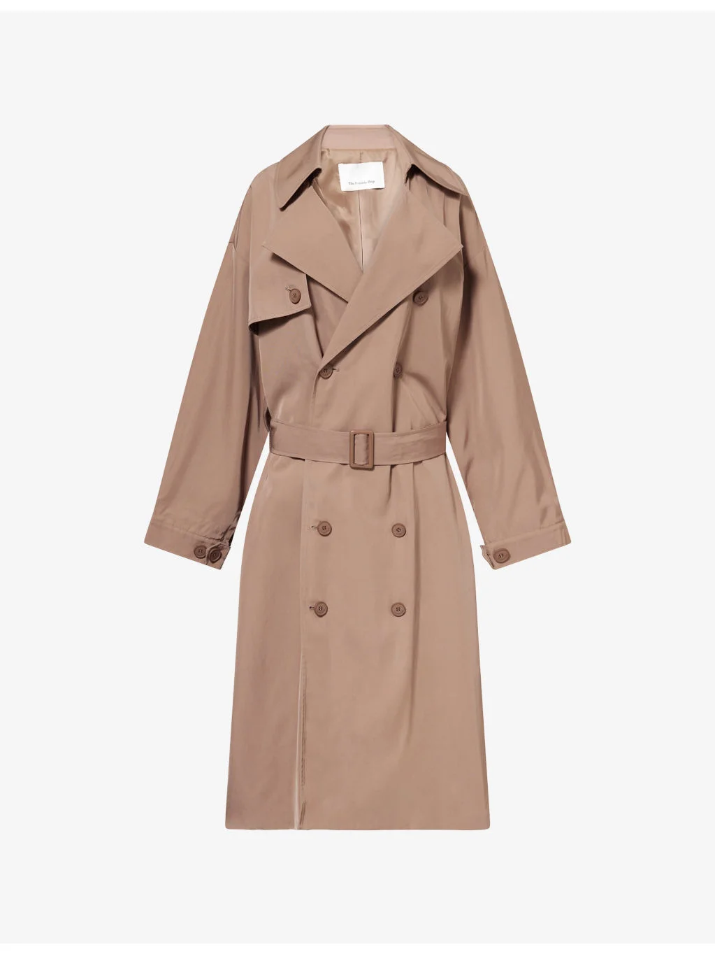 PRODUCT DETAILS - The Frankie Shop woven trench coat - 100% polyamide - Exposed button fastening at front - Oversized, double-breasted, notch lapels, long sleeves, buttoned cuffs, two slip pockets and buttoned panel at front, panel at back, belt loops, detachable belt, fully lined, single vent - Dry clean - True to size - Size small: length 49in / 125cm - Model is 5ft 10in/1.78m and wears a size small - Lightweight, non-stretch Ref: R04546991