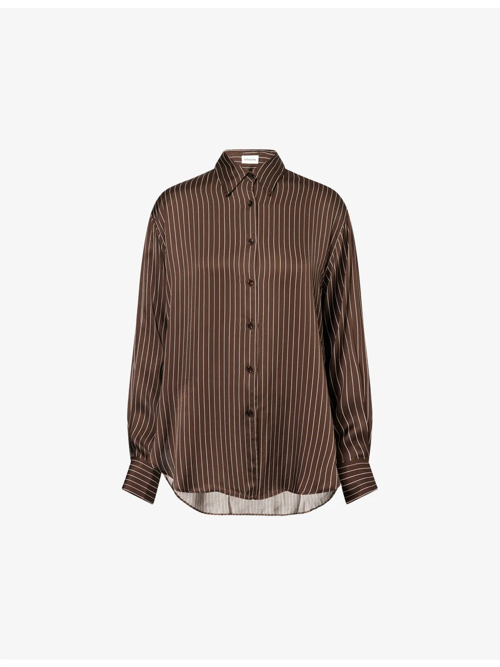 PRODUCT DETAILS - The Frankie Shop woven shirt - 100% viscose - Exposed button fastening at front - Spread collar - Buttoned cuffs - Relaxed fit collar, long sleeves, straight yoke at back, split at sides, all-over striped print, curved hem - Hand wash cold - Made in Morocco - True to size - Size small: length 30in / 76cm - Model is 5ft 10in/1.78m and wears a size small - Lightweight, stretchy Ref: R04587182