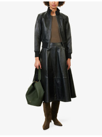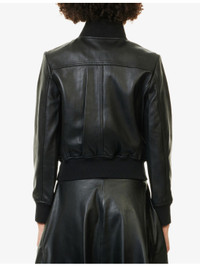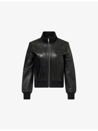 PRODUCT DETAILS - The Frankie Shop leather jacket - 100% leather - Exposed zip fastening at front - Regular fit, high-neck, long sleeves, welt pockets at front, ribbed trims, fully lined - Specialist leather clean - Made in India - True to size - Size small: length 22.5in / 57.5cm, chest 37in / 94cm - Model is 5ft 10in/1.78m and wears a size small - Midweight, non-stretch Ref: R04546999