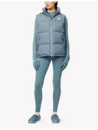 PRODUCT DETAILS - The North Face down gilet - 100% polyamide; filling 80% down, 20% feathers - Exposed zip fastening at front - Relaxed fit, funnel neck, roll-away concealed hood at collar, sleeveless, hook-and-loop tape elasticated cuffs, logo embroidery at chest and back, zip pockets at front, all-over padded and quilted, drawstring elasticated hem - Machine wash at 40°C - True to size - Size small: length 25in / 63.5cm - Model is 5ft 10in/1.78m and wears a size small - Midweight, non-stretch Ref: R04569821