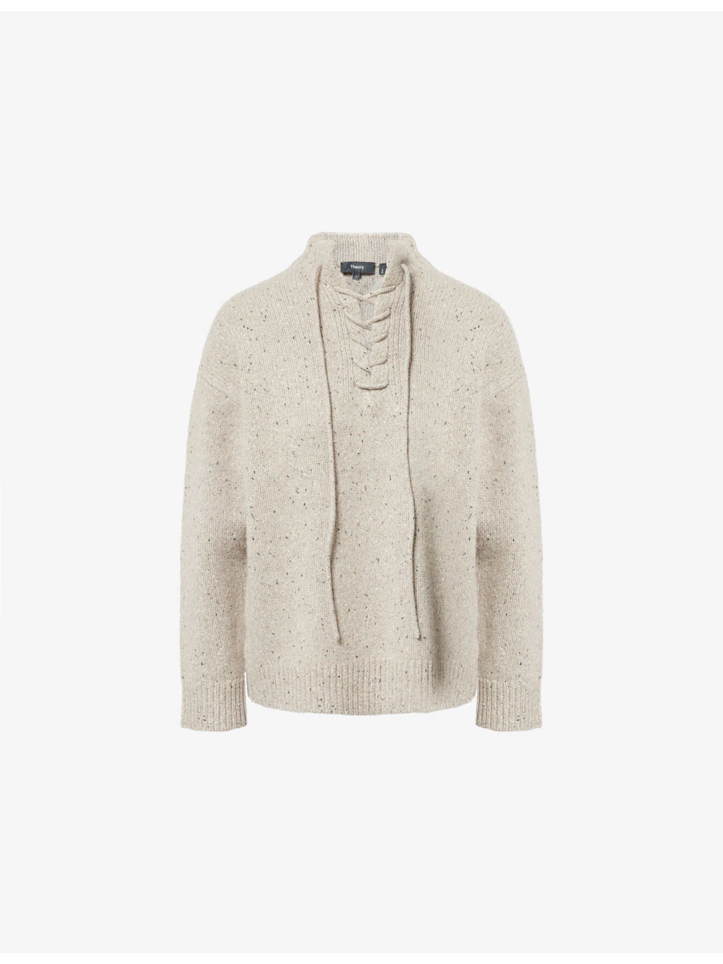 PRODUCT DETAILS - Theory wool-blend jumper - 56% wool, 32% cotton, 10% cashmere, 2% polyamide - Relaxed fit, high-neck, long sleeves, lace-up fastening at front, all-over mottled print, all-over knitted, ribbed trims - Dry clean - True to size - Model is 5ft 10in/1.78m and wears a size small - Midweight, stretchy Ref: R04531073