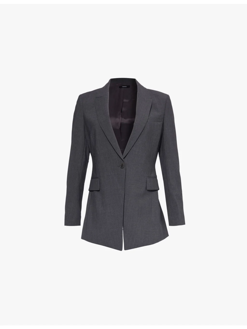 PRODUCT DETAILS - Theory stretch-wool blazer - 96% wool, 4% elastane; lining 100% cupro - Button fastening - Regular fit, single breasted, peak lapels, padded shoulders, long sleeves, buttoned sleeve hems, welt pocket at chest, flap pockets at front, open vent at back, lined - Dry clean - True to size - Size UK 8: length 28in / 71cm - Model is 5ft 10in/1.78m and wears a size UK 8 - Midweight, slight stretch Ref: R04226243
