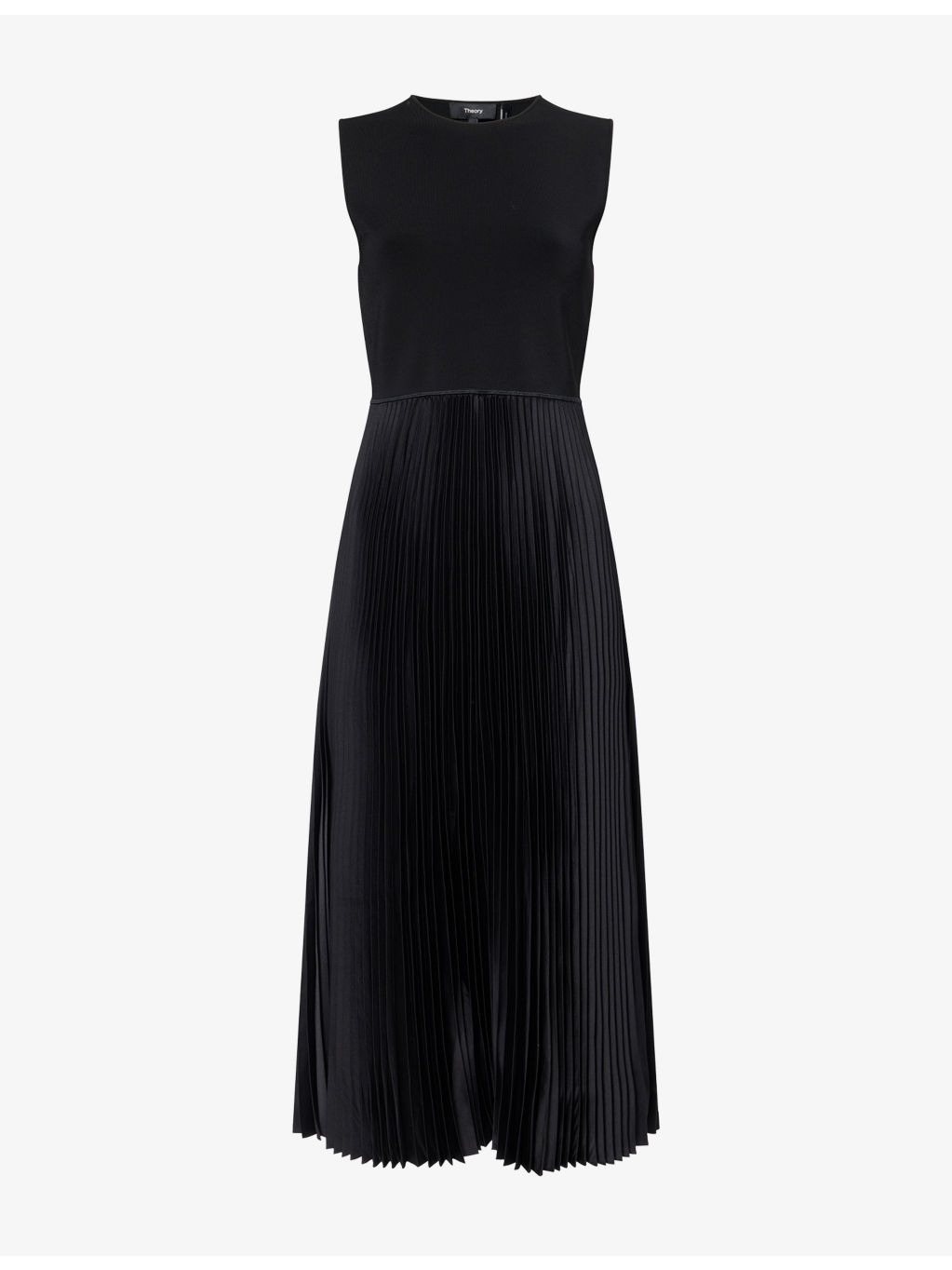PRODUCT DETAILS - Theory stretch-woven midi dress - 76% rayon, 22% nylon, 2% elastane; contrast 100% polyester - Regular fit, round-neck, sleeveless, knitted top, pleated satin skirt - Dry clean - True to size - Size small: length 45in / 115cm - Model is 5ft 10in/1.78m and wears a size small - Lightweight, stretchy Ref: R04531199
