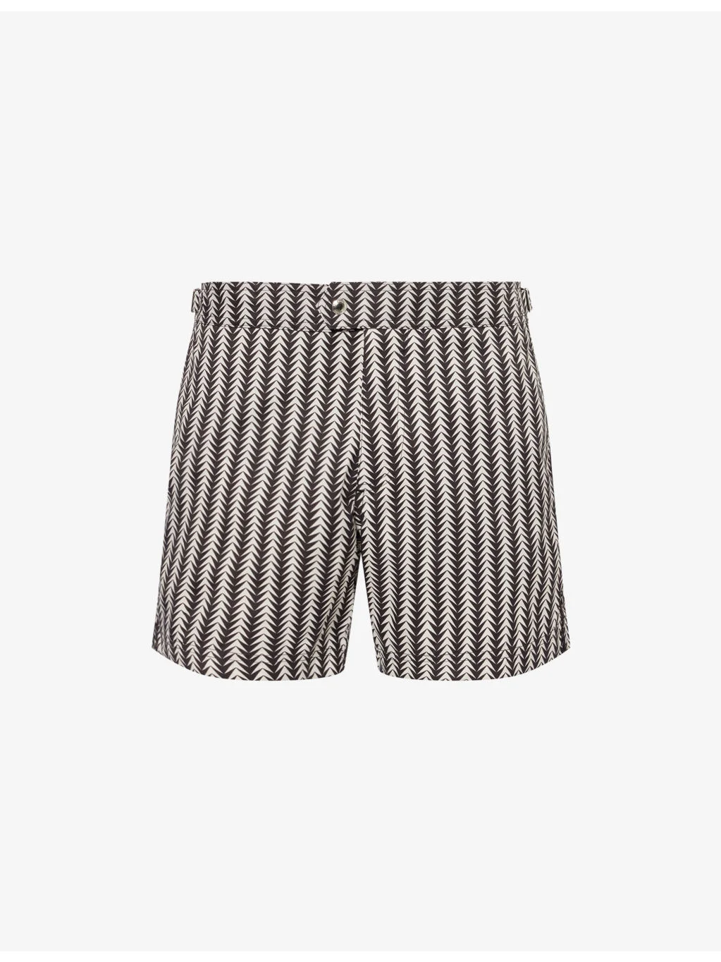 PRODUCT DETAILS - Tom Ford swim shorts - 100% polyester; lining 90% polyamide, 10% elastane - Concealed button, hook-and-eye and zip-fly fastening at front - Regular fit, mid-rise, buckle s at waistband, two slip pockets at front, zip pocket at back, all-over geometric print, partially lined, split cuffs - Hand wash cold - Made in Italy - Model is 6ft 2in/1.88m and wears a size UK 32 - Lightweight, slight stretch - For hygiene reasons, we are unable to exchange or refund this product, unless faulty. Ref: R04550746