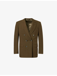 PRODUCT DETAILS - Tom Ford wool, cashmere and silk blazer - 61% wool, 23% cashmere, 16% silk; lining 100% viscose; sleevelining 100% cupro - Exposed button fastening at front - Regular fit, double-breasted, peak lapels, padded shoulders, long sleeves, welt pocket and two flap pockets at front, fully lined, double vent - Dry clean - Made in Italy - Size UK 40: length 30in / 77cm, chest 40in / 102cm - Model is 6ft 2in/1.88m and wears a size UK 40 - Midweight, slight stretch Ref: R04550689