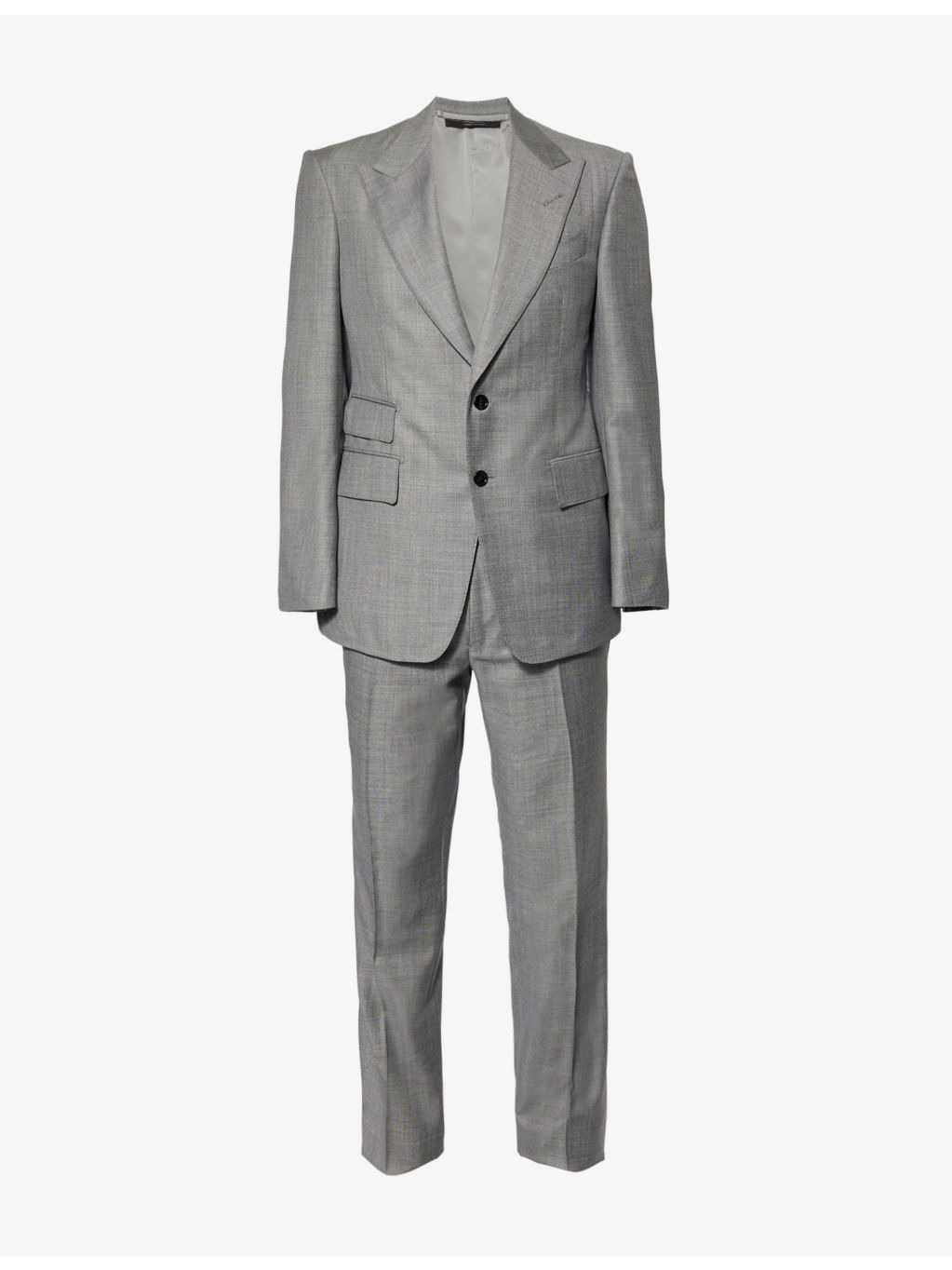 PRODUCT DETAILS - Tom Ford wool suit - 100% wool; lining 59% cupro, 41% silk; sleevelining 100% cupro - Exposed button fastenings at front - Jacket: - Regular fit, peak lapels, single-breasted, padded shoulders, long sleeves, cuff slits welt pocket at chest, three flap pockets at front, dual vents at back, four slip pockets at interior, lined - Unfinished hems, ready for tailoring - Trousers: - Regular fit, mid rise, slight tapered leg, waist adjusters at sides, branded hardware, two slip pockets at sides, pressed centre pleats at front and back, two buttoned jetted pockets at back, partially lined - Unfinished hems, ready for tailoring - Specialist dry clean only - Made in Italy - Jacket size UK 40: length 32in / 81cm, chest 40in / 102cm - Trousers size UK 40: rise 11in / 28cm, inside leg 36in / 91cm, leg opening 14in / 36cm - Model is 6ft 2in/1.88m and wears a size UK 40 - Midweight, non-stretch - Please note that altered garments cannot be returned in-store or online Ref: R04385135