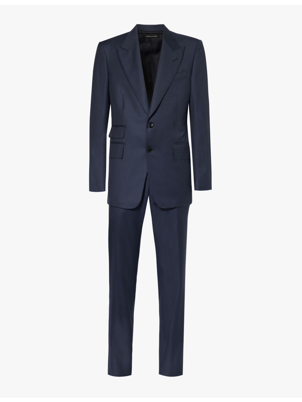 PRODUCT DETAILS - Tom Ford wool suit - 100% wool; lining 50% silk, 50% cupro; sleevelining 100% cupro - Jacket: - Regular fit, peak lapels, padded shoulders, long sleeves, buttoned cuffs, welt pocket at chest, darts at front, three flap pockets at front, single vent at back, four slip pockets at interior, fully lined - Unfinished hems, ready for tailoring - Trousers: - Regular fit, mid-rise, straight leg, structured waistband, two buckle-fastened waist adjusters at sides, two slip pockets at sides, pressed centre creases at front and back, darts at back, two buttoned jetted pockets at back, fully lined - Unfinished hems, ready for tailoring - Specialist dry clean - Made in Italy - Jacket size UK 40: length 30in / 76cm, chest 40in / 102cm - Trousers size UK 40: rise 10in / 26cm, inside leg 36in / 92cm, leg opening 14in / 36cm - Model is 6ft 1in/1.85m and wears a size UK 40 - Midweight, non-stretch - Please note that altered garments cannot be returned in-store or online. Ref: R04224304