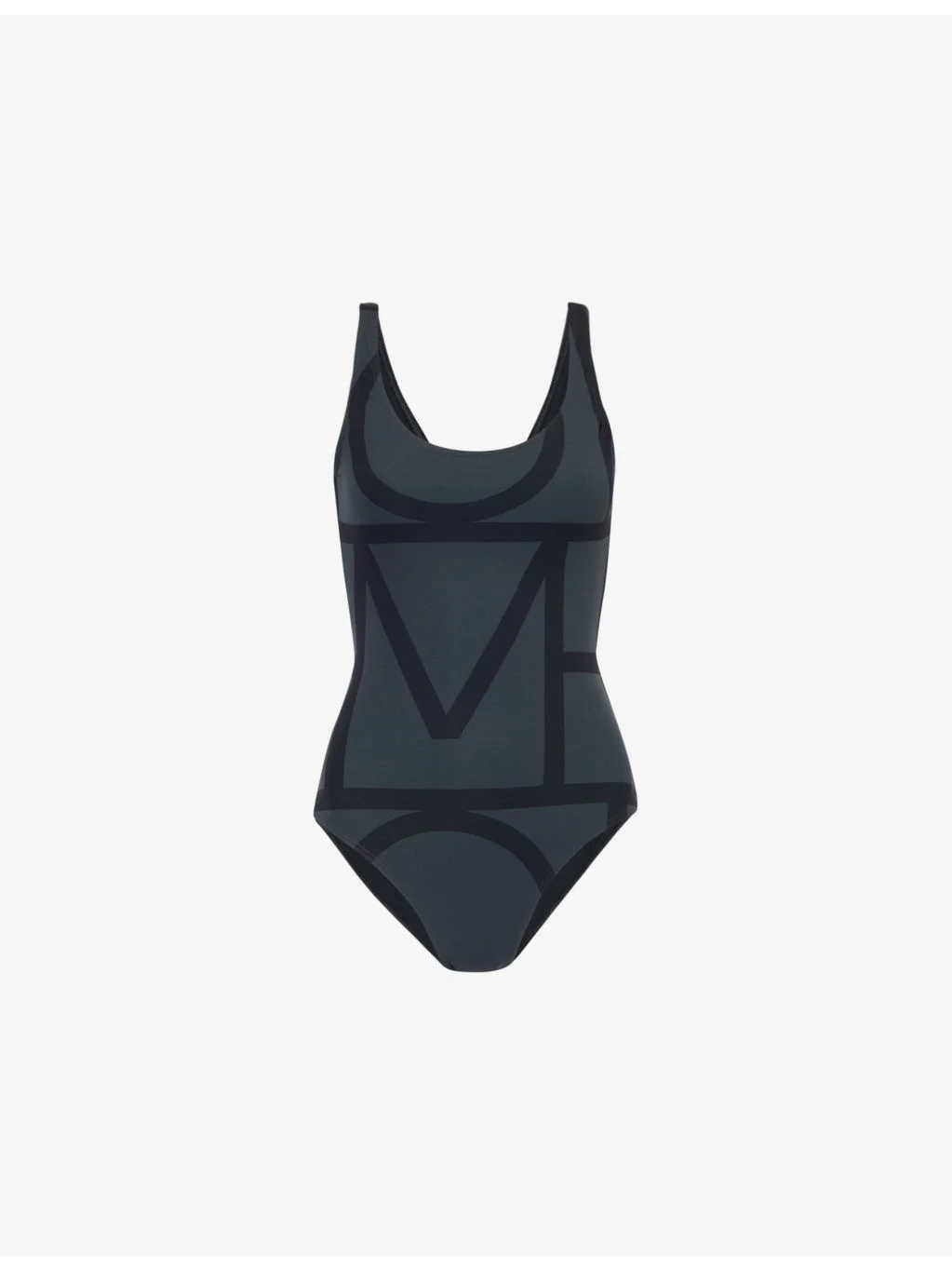 PRODUCT DETAILS - TOTEME swimsuit - 43% recycled polyamide, 29% cotton, 28% polyester - Slips on - Scoop neck, all-over brand print, high leg, scoop neckline at back, medium coverage - Machine wash cold - True to size - Model is 5ft 10in/1.78m and wears a size small - Lightweight, stretchy Ref: R04321552