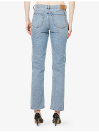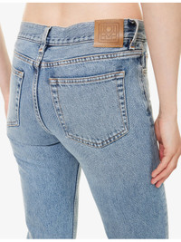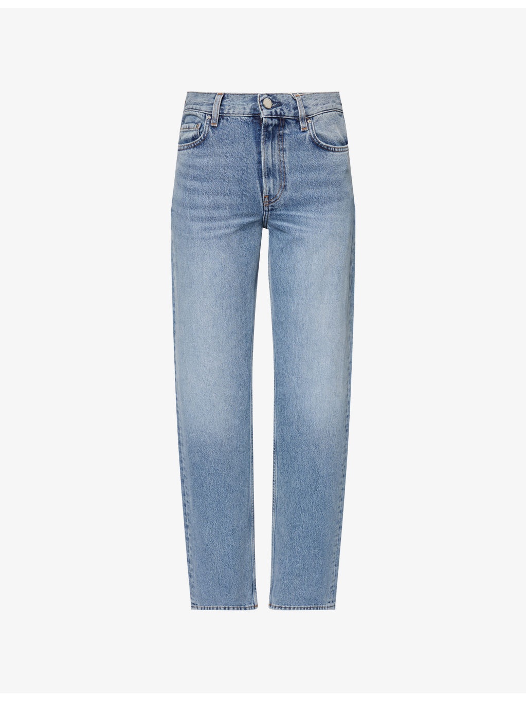 PRODUCT DETAILS - TOTEME denim jeans - 100% cotton - Exposed button and concealed zip-fly fastening at front - Straight leg, low-to-mid rise, belt loops, classic five pockets, leather brand patch at back, all-over dark wash effect, topstitch detailing - Machine wash at 30°C - Made in Italy - True to size - Size 26: rise 12in / 31cm, inside leg 31.4in / 80cm, leg opening 16in / 41cm - Model is 5ft 10in/1.78m and wears a size 26 - Midweight, non-stretch Ref: R04471246