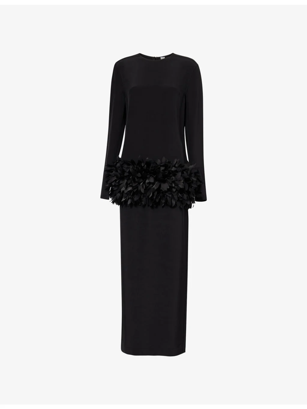 PRODUCT DETAILS - Toteme stretch-woven maxi dress - 56% viscose, 31% silk, 13% elastane; trims 100% silk - Concealed zip fastening at back - Relaxed it, round-neck, long sleeves, satin petal applique at front and back, split at back - Dry clean - True to size - Size UK 8: length 57in / 146cm - Model is 5ft 10in/1.78m and wears a size UK 8 - Lightweight, stretchy Ref: R04572957