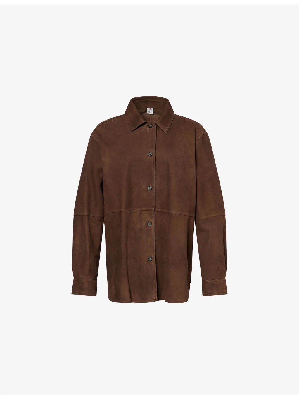 PRODUCT DETAILS - Toteme suede overshirt - 100% lamb leather - Exposed button fastening at front - Spread collar - Buttoned cuffs - Relaxed fit, collar, long sleeves, all-over suede leather, curved hem - Specialist leather clean - Made in Turkey - True to size - Size UK 8: length 28in / 72cm - Model is 5ft 10in/1.78m and wears a size UK 8 - Midweight, non-stretch Ref: R04572937