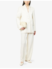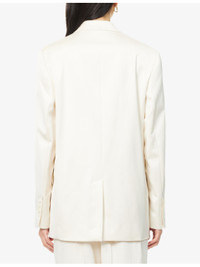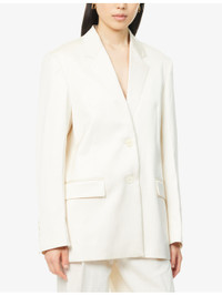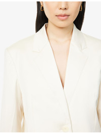 PRODUCT DETAILS - TOTEME stretch-woven blazer - 55% viscose, 43% cotton, 2% elastane; lining 100% viscose - Exposed button fastening at front - Regular fit, single-breasted, stitched notch lapels, structured shoulders, long sleeves, buttoned cuffs, two flap pockets at front, all-over satin texture, fully lined, single vent - Dry clean - Made in Romania - True to size - Size UK 8: length 29in / 74cm - Model is 5ft 10in/1.78m and wears a size UK 8 - Midweight, slight stretch Ref: R04471198
