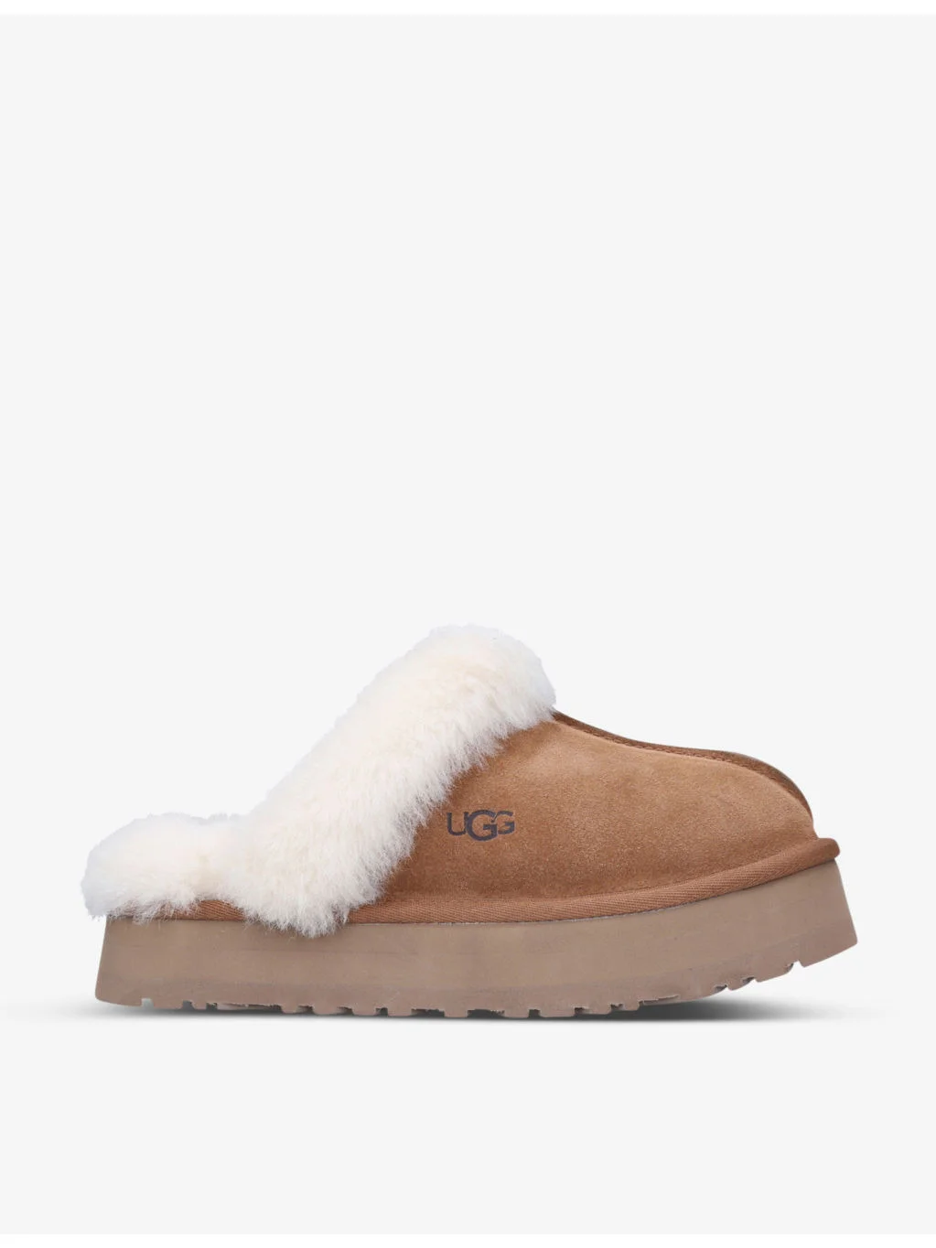 PRODUCT DETAILS - UGG shearling-lined suede slippers - 100% suede - Slips on - Round closed-toe, shearling-lined, shearling trims, raised bar at front, brand embroidered at side, open back, flat sole - Specialist leather clean - Made in UK - Upper: 100% suede - Lining: 100% sheepskin - Sole: 100% EVA