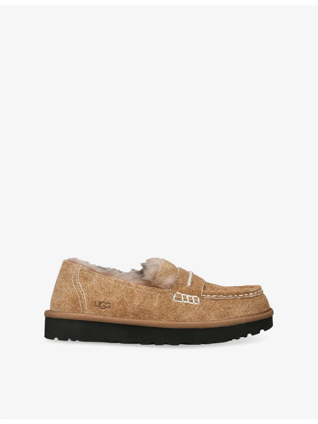 PRODUCT DETAILS - UGG suede loafers - Round toe, penny front, topstitching, shearling lining, hairy finish - Specialist leather clean - Upper: 100% suede - Lining: 100% shearling - Sole: 100% EVA Ref: R04575018