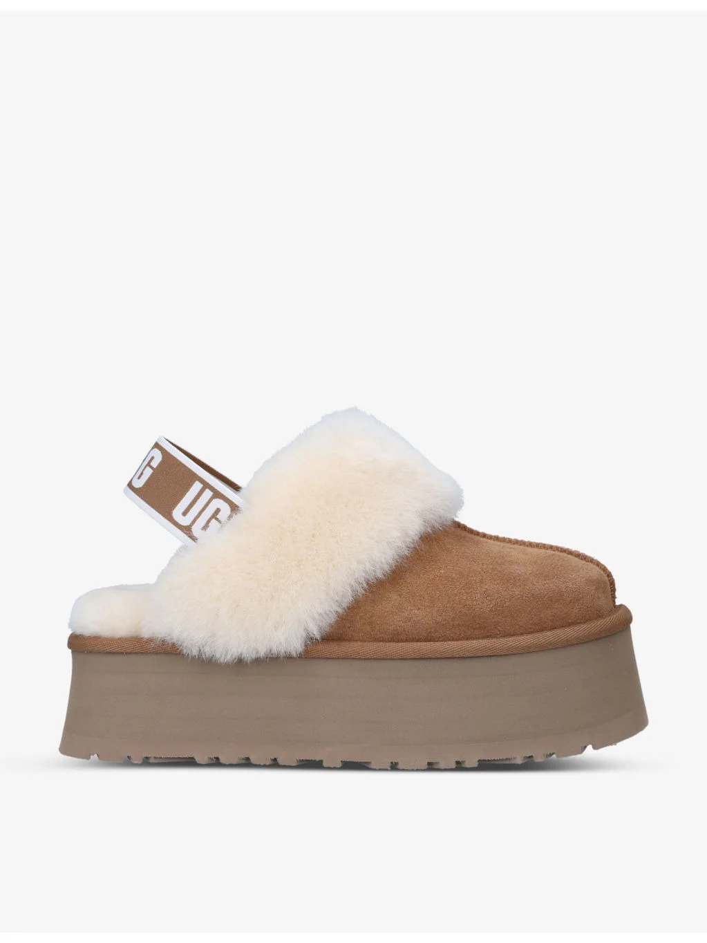 PRODUCT DETAILS - UGG suede slippers - suede - Slips on - Round toe, centre seam, sheepskin lining and trim, branded elasticated strap, platform sole - Upper: leather - Lining: sheepskin - Sole: synthetic