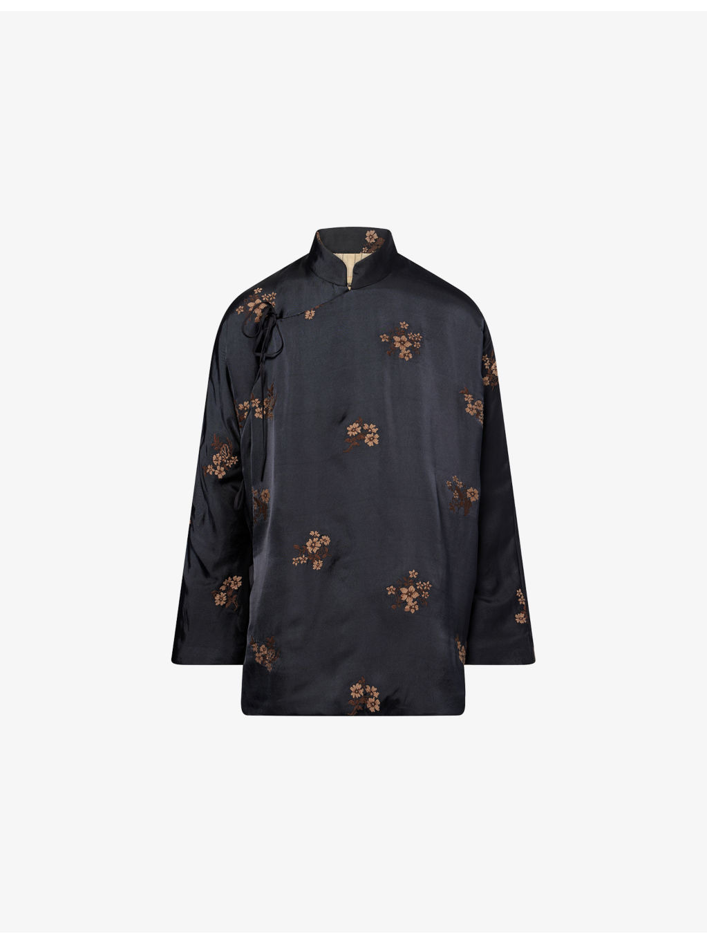 PRODUCT DETAILS - Uma Wang cotton-blend jacket - 52% cotton, 34% cupro, 14% viscose; lining 50% viscose, 50% cupro - Self-tie fastening at front - Relaxed fit, band collar, wrap front, long sleeves, all-over floral embroidery, all-over satin texture, padded, fully lined, split at sides - Dry clean - Made in Italy - True to size - Size small: length 28in / 71cm - Model is 5ft 10in/1.78m and wears a size small - Lightweight, slight stretch Ref: R04507928