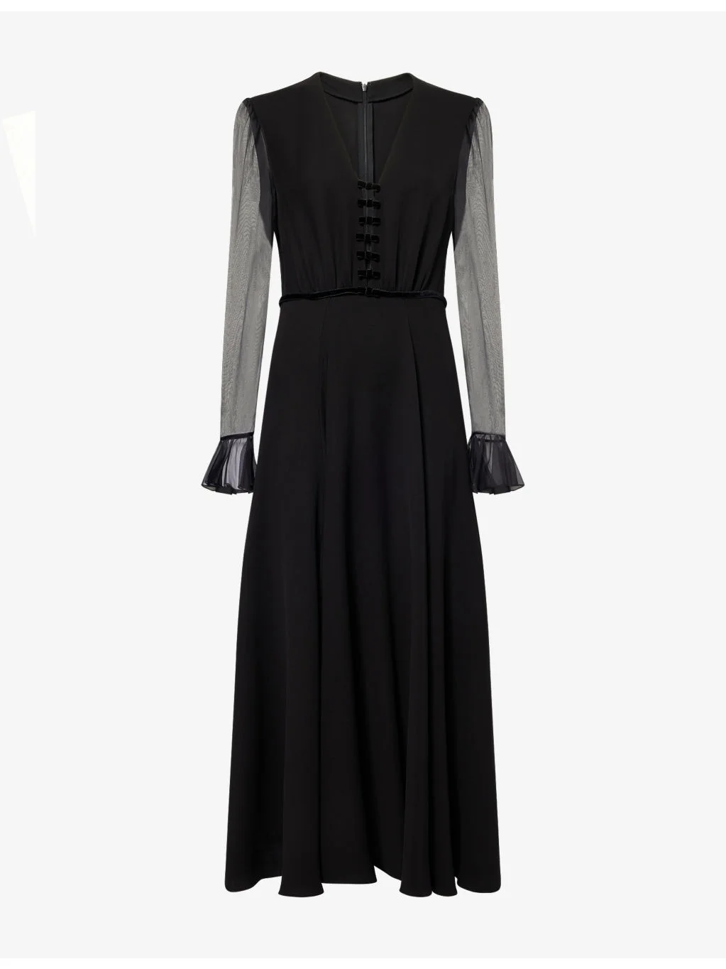 PRODUCT DETAILS - Valentino silk midi dress - 100% silk; trims 90% viscose, 10% polyamide - Concealed zip fastening at back - Regular fit, V-neck, sheer long sleeves, riffled cuffs, velvet bows embellishment at front and belt, all-over crepe texture, flared hem - True to size - Made in Italy - Dry clean - Size UK 40: length 49in / 102cm - Model is 5ft 10in/1.78m and wears a size UK 40 - Lightweight, slight stretch Ref: R04462392