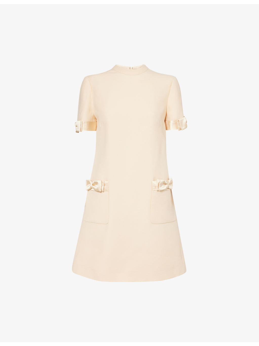 PRODUCT DETAILS - Valentino wool and silk mini dress - 65% virgin wool, 35% silk; contrast 100% acetate; lining 100% silk - Concealed zip fastening at back - Relaxed fit, H-line silhouette, band collar, short sleeves, satin bow applique at front and cuffs, two patch pockets at front, fully lined - Dry clean - Made in Italy - True to size - Size UK 8: length 34in / 87cm - Model is 5ft 10in/1.78m and wears a size UK 8 - Midweight, stretchy Ref: R04462349