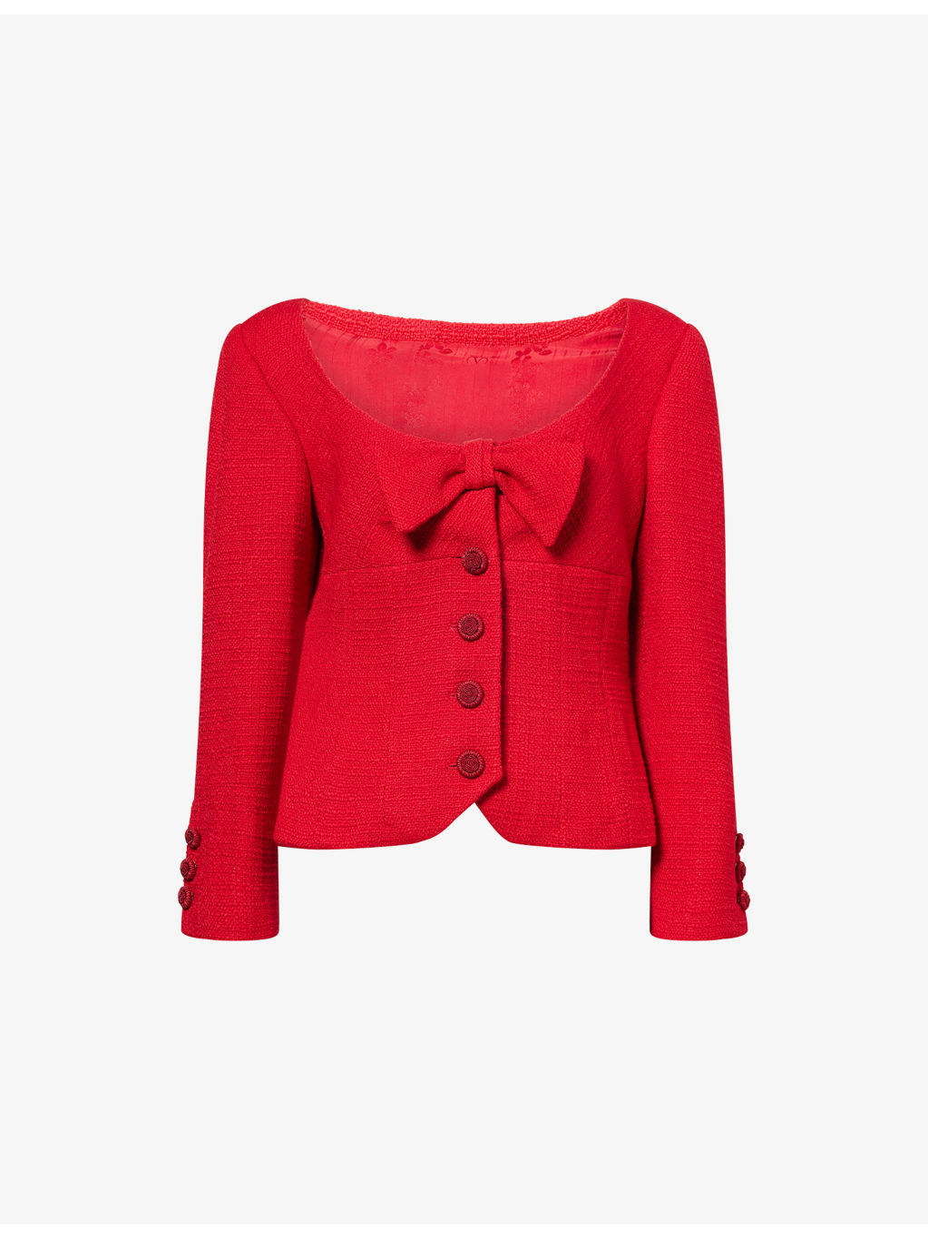 PRODUCT DETAILS - Valentino Garavani tweed jacket - 97% virgin wool, 3% polyamide; lining 74% acetate, 26% silk - Exposed button fastenings at front - Regular fit, scoop neck, padded shoulders, long sleeves, buttoned cuffs, bow embroidered at front, rose rope buttons, tweed texture, fully lined - Specialist dry clean only - Made in Italy - Size UK 10: length 20in / 51cm - Model is 5ft 10in / 1.78m and wears a size UK 10 - Midweight, non-stretch Ref: R04505700