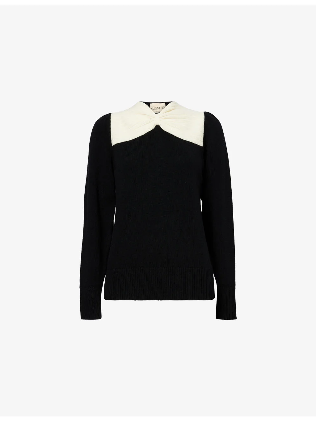 PRODUCT DETAILS - Valentino wool jumper - 100% virgin wool - Regular fit, V-neck, long sleeves, contrast bow design panel at front, all-over knitted, ribbed trims - Dry clean - Made in Italy - True to size - Model is 5ft 10in/1.78m and wears a size small - Midweight, stretchy Ref: R04550171