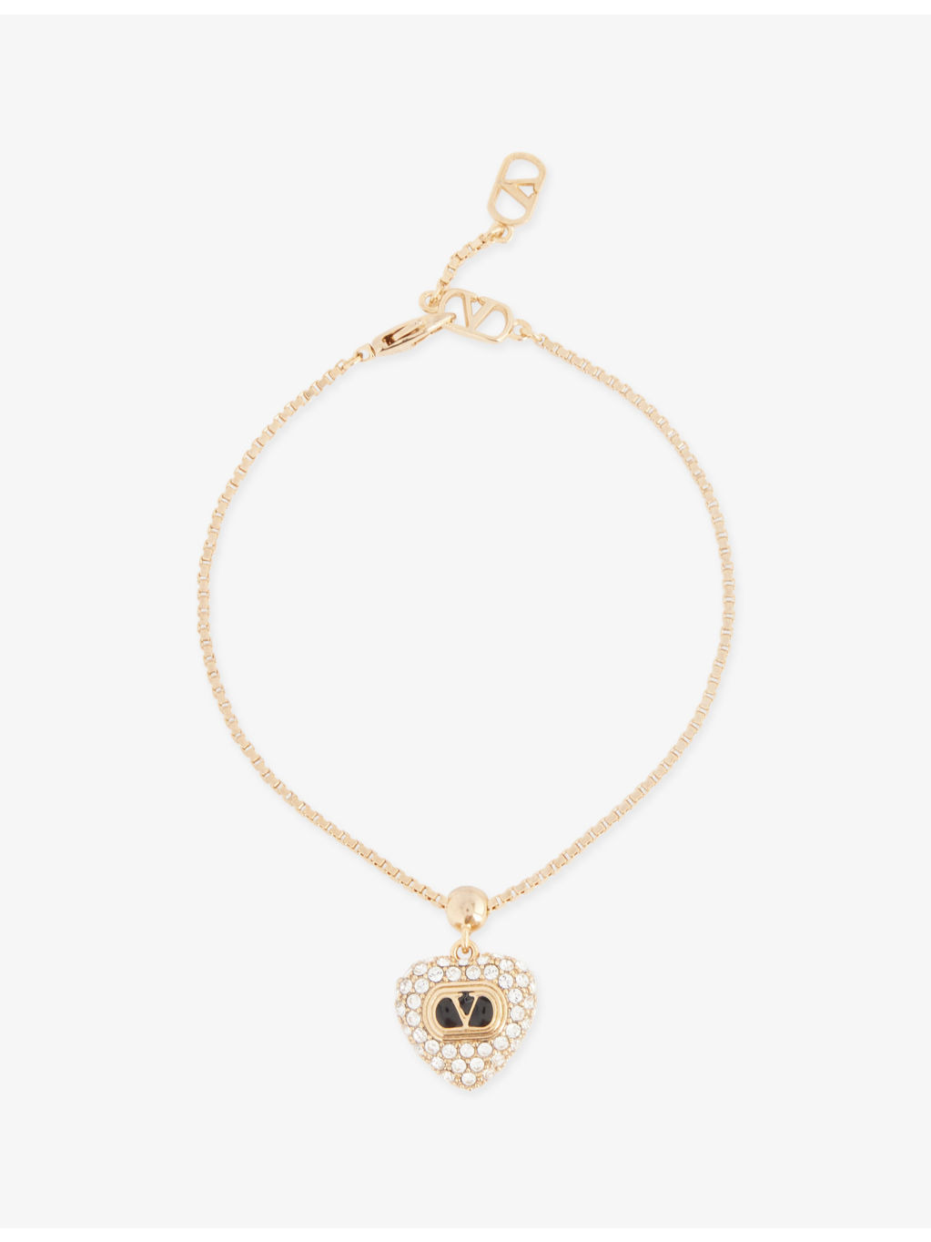 PRODUCT DETAILS - Valentino Garavani metal and Swarovski crystal bracelet - 100% metal; stones 10 swarovski crystals - Lobster-clasp fastening - Fine link chain, central heart-shape plaque, monogram plaque, crystal pave setting, gold-toned - Chain length: 18cm - Chain width: 2mm - Made in Italy - Please use a soft, dry polishing cloth - Comes with a dust bag, presented in a box Ref: R04510832