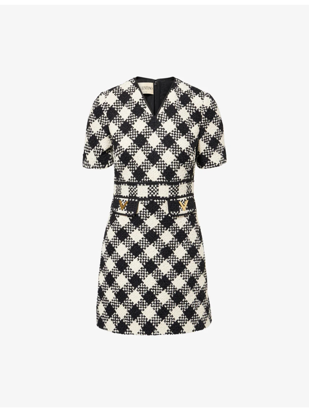 PRODUCT DETAILS - Valentino Garavani woven mini dress - 44% cotton, 18% wool, 16% viscose, 12% acrylic, 8% polyamide, 2% mohair wool; lining 74% acetate, 26% silk - Concealed zip fastening - Regular fit, V-neckline, short sleeves, flaps at front, V hardware at flaps, diamond check pattern, lined - Dry clean - True to size - Size UK 8: length 34in / 86cm - Model is 5ft 10in/1.78m and wears a size UK 8 - Midweight, non-stretch Ref: R04550184