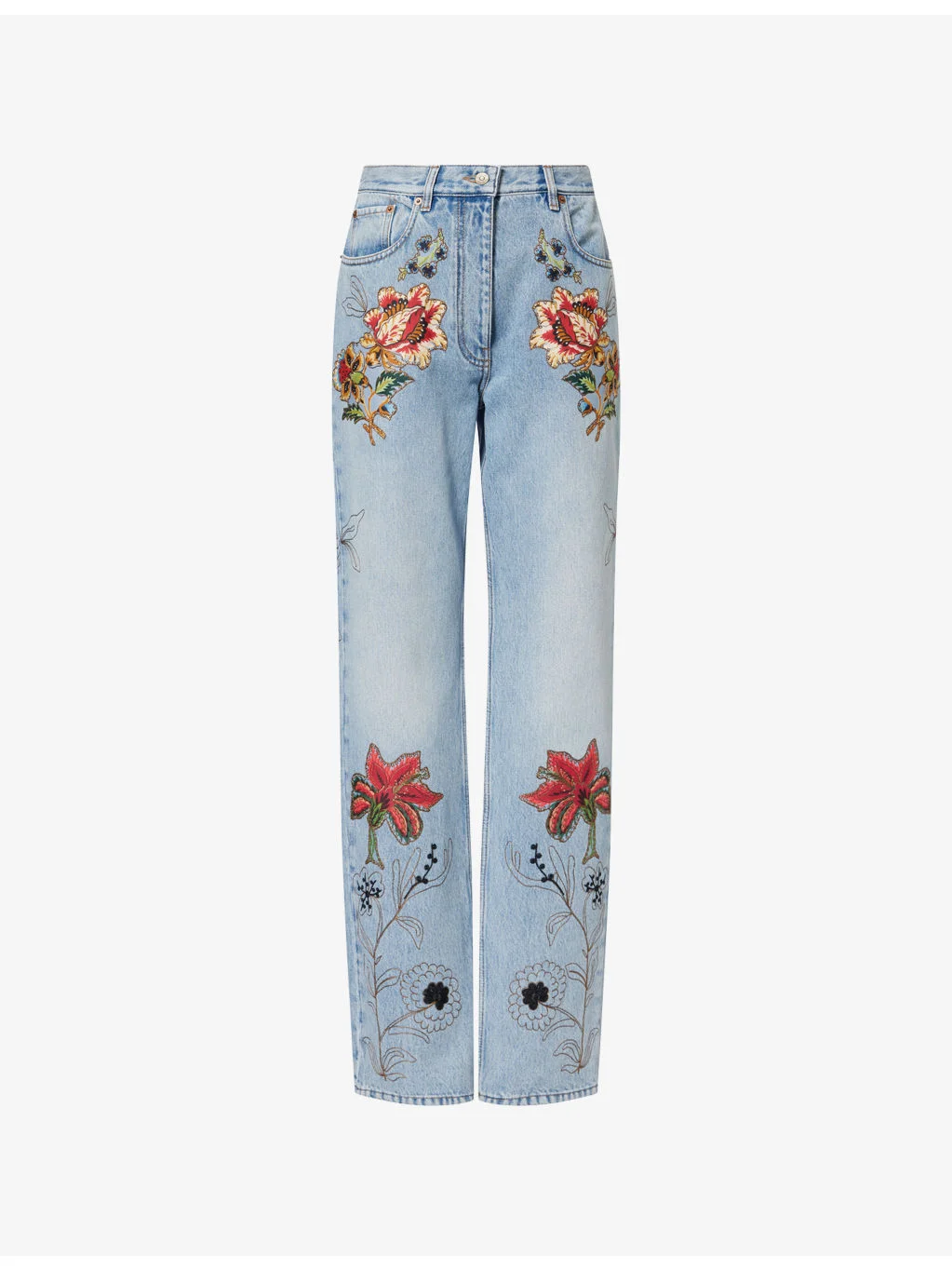 PRODUCT DETAILS - Valentino Garavani denim jeans - 100% cotton - Button and zip-fly fastening - Regular fit, mid-rise, straight leg, structured waistband with belt loops, five pockets, floral embroidery, mid-faded wash, logo patch, branded hardware - Machine wash cold - Made in Italy - True to size - Size 26: rise 12in / 31cm, inside leg 35in / 89cm, leg opening 17in / 43cm - Model is 5ft 10in/1.78m and wears a size 26 - Midweight, non-stretch Ref: R04550168