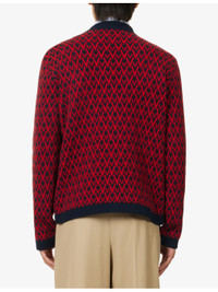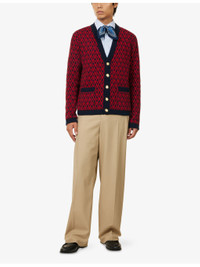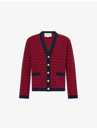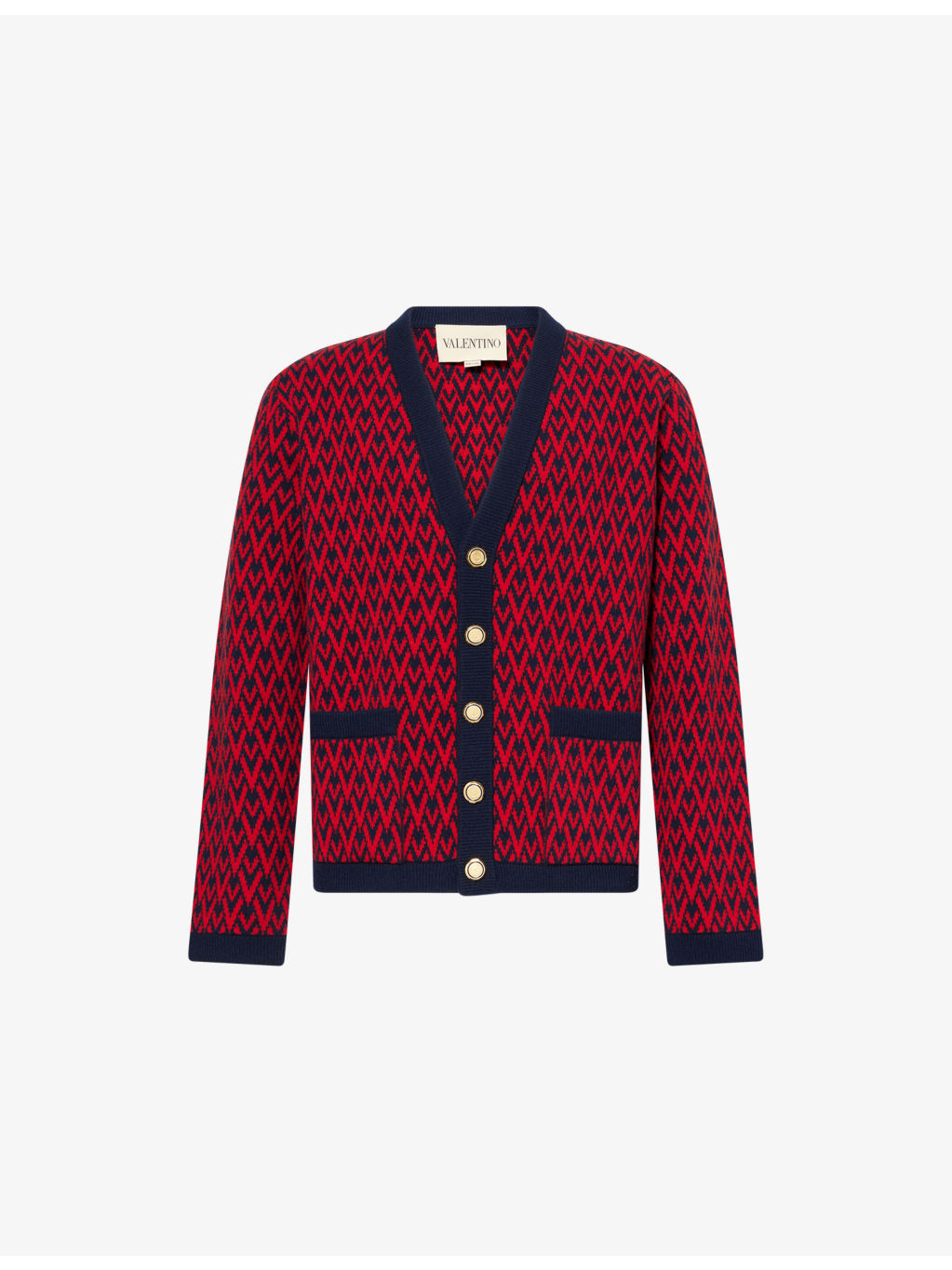 PRODUCT DETAILS - Valentino wool cardigan - 100% virgin wool - Exposed button fastening at front - Relaxed fit, V-neck, long sleeves, two welt pockets and branded buttons at front, all-over monogram print, all-over knitted, contrast ribbed trims - Dry clean - Made in Italy - Size medium: length 26in / 66cm, chest 44in / 112cm - Model is 6ft 2in/1.88m and wears a size large - Midweight, stretchy Ref: R04471302