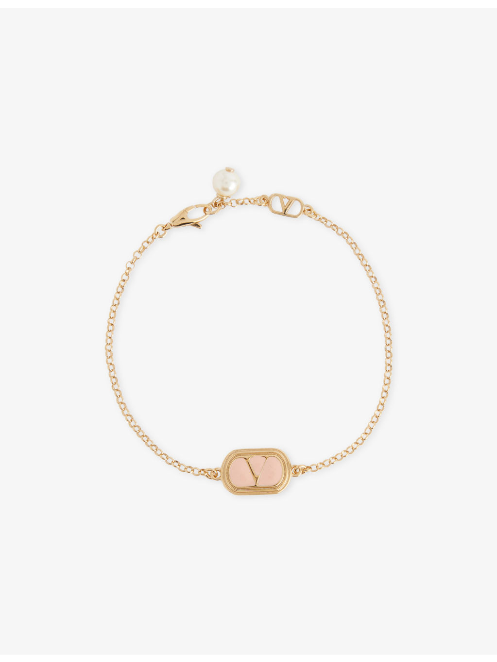 PRODUCT DETAILS - Valentino Garavani gold-plated metal and Swarovski pearl bracelet - 100% metal; plating 100% gold; stones 1 swarovski crystals - Lobster-clasp fastening - Fine link chain, central enamelled rectangular plaque, engraved branding at front and back, hanging pearl at fastening - Chain length: 19cm - Chain width: 2mm - Please use a soft, dry polishing cloth - Comes with a dust bag, presented in a box Ref: R04467845