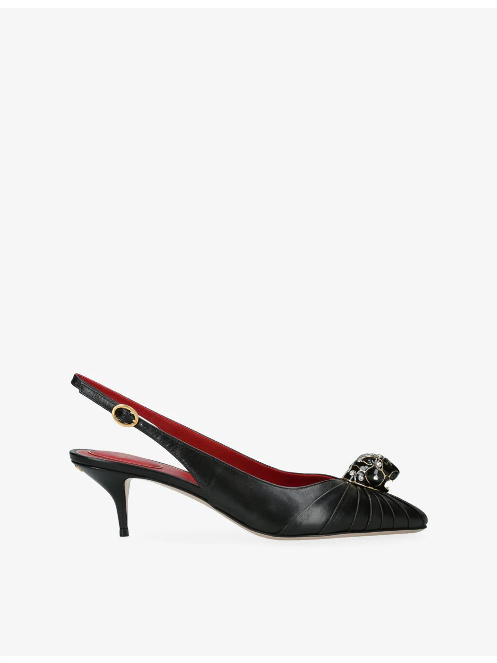 PRODUCT DETAILS - Valentino Garavani leather pumps - 100% leather - Adjustable buckle fastening - Pointed closed toe, crystal-embellished hardware at front, adjustable slingback strap, gold-toned VLogo hardware at back, branded footbed, stiletto heel - Heel height 55mm / 2.16in - Specialist leather clean - Made in Italy - Upper: 100% leather - Lining: 100% leather - Sole: 100% leather Ref: R04511970