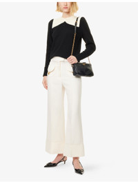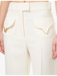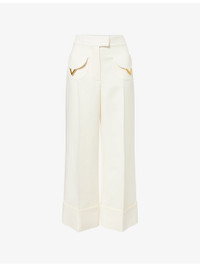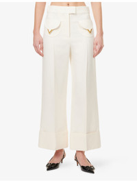 PRODUCT DETAILS - Valentino Garavani wool and silk-blend trousers - 65% wool, 35% silk - Button, hook-and-eye and zip-fly fastening - Regular fit, high-rise, wide cropped leg, turn-ups at cuffs, branded hardware at front flap pockets, pressed creases, two side slip pockets, two rear welt pockets - Dry clean - Made in Italy - True to size - Size UK 8: rise 13in / 33cm, inside leg 28in / 71cm, leg opening 24.5in / 62cm - Model is 5ft 10in/1.78m and wears a size UK 8 - Midweight, non-stretch Ref: R04550178