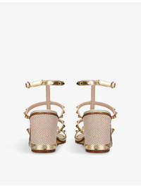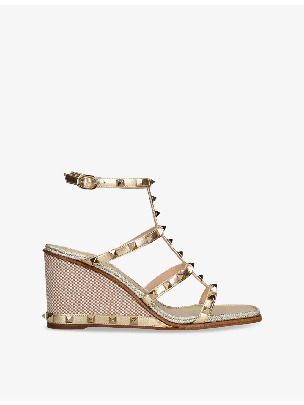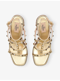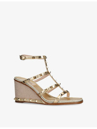 PRODUCT DETAILS - Valentino Garavani metallic-leather wedge sandals - 100% leather - Adjustable buckle fastening - Open square toe, multi-strap upper, metallic upper, all-over stud embellishments, ankle strap, embroidered wedge heel, stud-embellished trim at heel - Heel height 3.2” - Specialist leather clean - Made in Spain - Upper: 100% leather - Lining: 100% leather - Sole: 100% leather Ref: R04473768