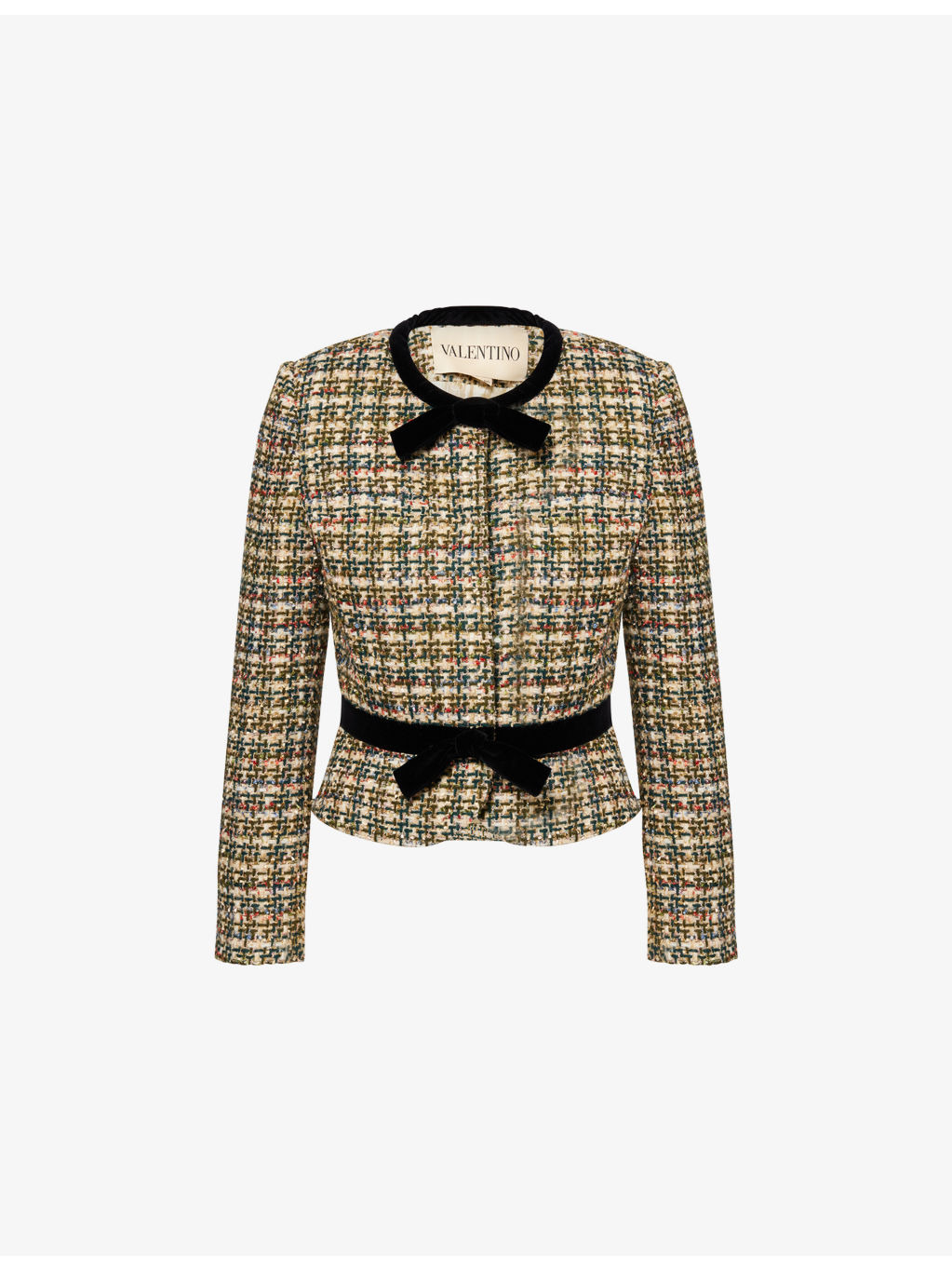 PRODUCT DETAILS - Valentino woven jacket - 36% wool, 36% acrylic, 22% polyamide, 6% metallic fibres; contrast 100% cotton; lining 100% viscose; trims 100% polyester - Concealed popper fastening at front - Regular fit, cropped, round-neck, padded shoulders, long sleeves, rhinestone heart-shaped button at cuffs, all-over tweed texture, all-over metallic weave, velvet panels and bows applique at front, fully lined - Dry clean - Made in Italy - True to size - Size UK 8: length 20in / 51cm - Model is 5ft 10in/1.78m and wears a size UK 8 - Midweight, slight stretch Ref: R04505631