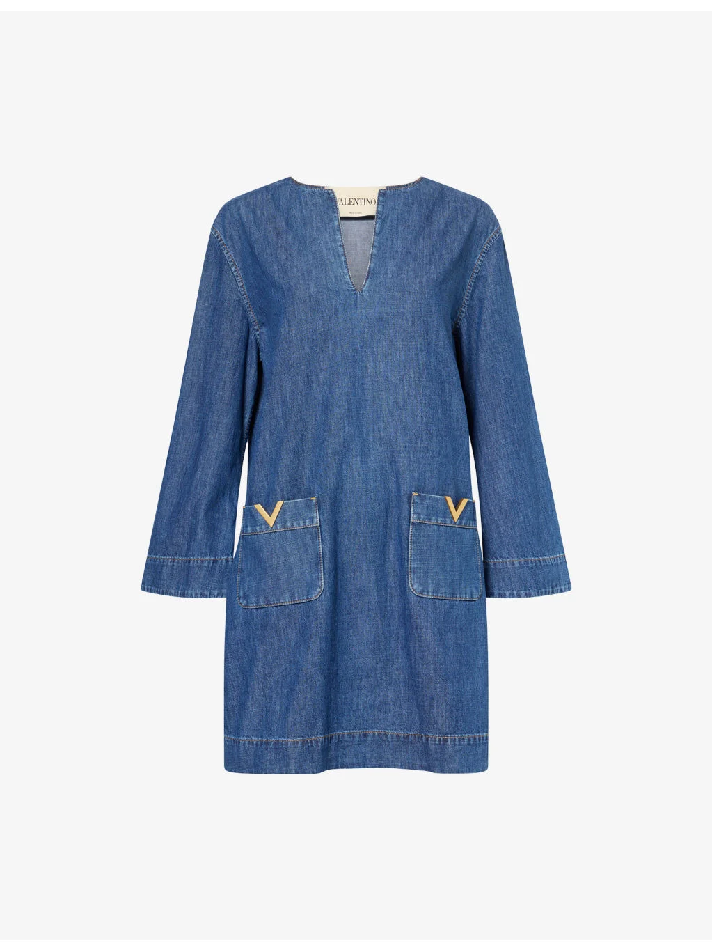PRODUCT DETAILS - Valentino Garavani denim midi dress - 100% cotton - Relaxed fit, round neckline with V-cut, long wide sleeves, patch pockets at front, V hardware at pockets, mid-wash, contrast stitching - Machine wash cold - Made in Italy - True to size - Size UK 8: length 33in / 84cm - Model is 5ft 10in/1.78m and wears a size UK 8 - Lightweight, non-stretch Ref: R04550162